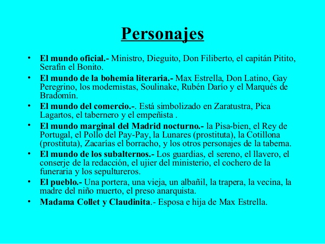 El protagonista de Luces de Bohemia, Max Estrella, es un personaje que nace de una persona: el poeta ciego Alejandro Sawa. Como gesto de agradecimiento a este comportamiento, Valle Incln le introduce como personaje en Luces de Bohemia, aunque tambin es cierto, que Alejandro Sawa (figura en la que se basa Max Estrella) tuvo una gran relacin con Rubn, por lo que puede ser otro motivo de su introduccin en la. Continuamos con este resumen por escenas de Luces de Bohemia para, en esta ocasin, agrupar las que se encuentran en el corazn de la obra de Valle Incln: de la escena 6 a la 10. Resumen de la escena 6 de Luces de Bohemia. Max est preso en un calabozo, esposado y ensagrentado. Luces de bohemia: se basa en la deformacin de la realidad y la parodia de los modelos clsicos, as como en la creacin de un lenguaje donde lo sublime y lo vulgar conviven en partes iguales. Luces de bohemia narra las ltimas horas de la vida de Max Estrella, un hiperblico andaluz, poeta de odas y madrigales ya anciano, miserable y ciego que goz en algn momento de. Luces de Bohemia ESPERPENTO DRAMATIS PERSONAE decan de l que, con sus ojos tristones, abundante cabellera y siempre vestido de luto, fascinaba al auditorio. Casi todos sus contemporneos le vean como un joven osado y elocuente, lleno de posibilidades. Pero se qued en eso: en las posibilidades. Luces de bohemia es considerada la obra ms representativa del esperpento, un gnero en el que ValleIncln presenta personajes grotescos y animalizados, similares a tteres o mscaras, con argumentos violentos y desagradables y una visin cida y crtica de la naturaleza humana. Luces de Bohemia, de Ramn del ValleIncln. La gran obra de ValleIncln que inaugur una nueva forma de ver lo real Utilizamos cookies propias y de terceros para recopilar informacin estadstica del uso de nuestra pgina web y mostrarle publicidad relacionada con sus preferencias mediante el anlisis de sus hbitos de navegacin. Luces de bohemia (1920) es la primera obra a la que ValleIncln da el nombre de esperpento. Con esta palabra cuyo significado habitual era persona o cosa extravagante, desatinada o absurda. VALLEINCLN Luces de bohemia (de la escena XI) 2. 3 Valoracin del contenido Este texto reproduce el momento en el cual van caminando por la calle Don Latino y Max, donde en la escena anterior fueron seducidos por dos mujeres. 1 LUCES DE BOHEMIA, Ramn M del ValleIncln (Gua de lectura) O. El autor y su obra en su contexto histrico. Estructura de la obra: breve resumen del contenido de cada una de las escenas, destacando los aspectos ms significativos. 24 de febrero de 2018 Comentarios desactivados en Luces de bohemia de Ramn M. del ValleIncln Material de clase: Luces de bohemia en PDF (con anotaciones). Luces de bohemia es un esperpento trgico de la vida literaria de la poca. Al degradarse la realidad aparece la farsa y, en un segundo nivel, el esperpento; Los hroes clsicos reflejados en los espejos cncavos dan el Esperpento. GUA DE LECTURA DE LUCES DE BOHEMIA (VALLEINCLN) Las anotaciones siguientes corresponden a una lectura guiada de Luces de bohemia en Twitter y en Tuenti, en sesiones llevadas a cabo a lo largo de octubre y noviembre de 2010, con el fin de servir de apoyo al alumnado de 2 de Bachillerato del. LUCES DE BOHEMIA Apuntes para 2 de bachillerato. Gneros de raigambre decimonnica 3 Teatro de texto, conservador en temas, esttica e interpretacin, para un pblico pasivo (es intil poner Espritu de renovacin 5 Recibido con acritud por el pblico. A pesar de lo dicho, no debemos pensar que Luces de bohemia no sea verdadero teatro. Lo que sucede es que el concepto teatral de Valle es, quizs, demasiado moderno, supera a los usos corrientes en su poca. Luces de bohemia en el contexto histrico y literario de su poca 2. Luces de bohemia y la realidad poltica y social 3. Modernismo y 98 en Luces de bohemia Luces de Bohemia 7 yermo de las almas, una nueva versin de aquel drama primerizo titulado Cenizas. Aunque tal vez el escritor escribi esta obra con la idea de aproximarse a los gustos imperantes, el estreno no tendr lugar hasta 1915 y Luces de. Resumen de las escenas de la obra. ESCENA 1: Max Estrella, un poeta ciego, y Madame Collet, su mujer, estn hablando sobre una carta que han recibido en la que le dicen a Max que ha sido despedido. Luces de bohemia 4 Don Gay Peregrino. hombre alto, flaco, tostado del sol. Viste un traje de antiguo voluntario cubano, calza alpargates abiertos de caminante y se cubre con una gorra inglesa. Valoracin crtica de Luces de bohemia por Juan Torralba en el blog Lengua para tontos Guia de lectura: Luces de Bohemia 2 Luces de Bohemia es una obra que se suele calificar de compleja; sin embargo, en algunos de. Se dedic a cuidar a sus compaeros de cuativerio con especial abnegacin. Al ser liberados, en 1923, le sealaban como un hroe, y cuando lleg a Espaa, en enero de ese ao, su fama era enorme. popular que se refiere a la calle donde se hallaban las oficinas de la. Luces de Bohemia (PDF) Ramn Mara del Valle Incln Con esta obra se inaugur el gnero del esperpento, en el que Valle Incln muestra su particular visin de la realidad social. a utilizarse a partir de la publicacin de Luces de bohemia. Luces de bohemia cuenta la ltima noche de Max Estrella, un poeta miserable y ciego. Como punto de partida, el autor se inspir en la figura y muerte del novelista Alejandro Sawa. Luces de bohemia (de la escena XI) EL RETIRADO. El Principio de Autoridad es inexorable. Las anotaciones siguientes corresponden a una lectura guiada de Luces de bohemia en Twitter y en Tuenti, en sesiones llevadas a cabo a lo largo de octubre y noviembre de 2010, con el fin de servir de apoyo al alumnado de 2 de Bachillerato del IES Bovalar (Castell de la Plana). esposa de Valle, con la que contraer matrimonio en 1907. La boda se celebr en la madrilea iglesia de San Sebastin. El matrimonio tuvo varios hijos. Sus tema es la escena XII de Luces de Bohemia, donde Max Estrella, el protagonista de la obra, dice Luces 